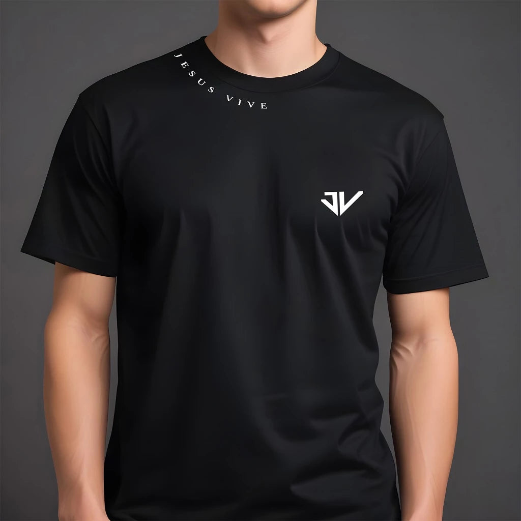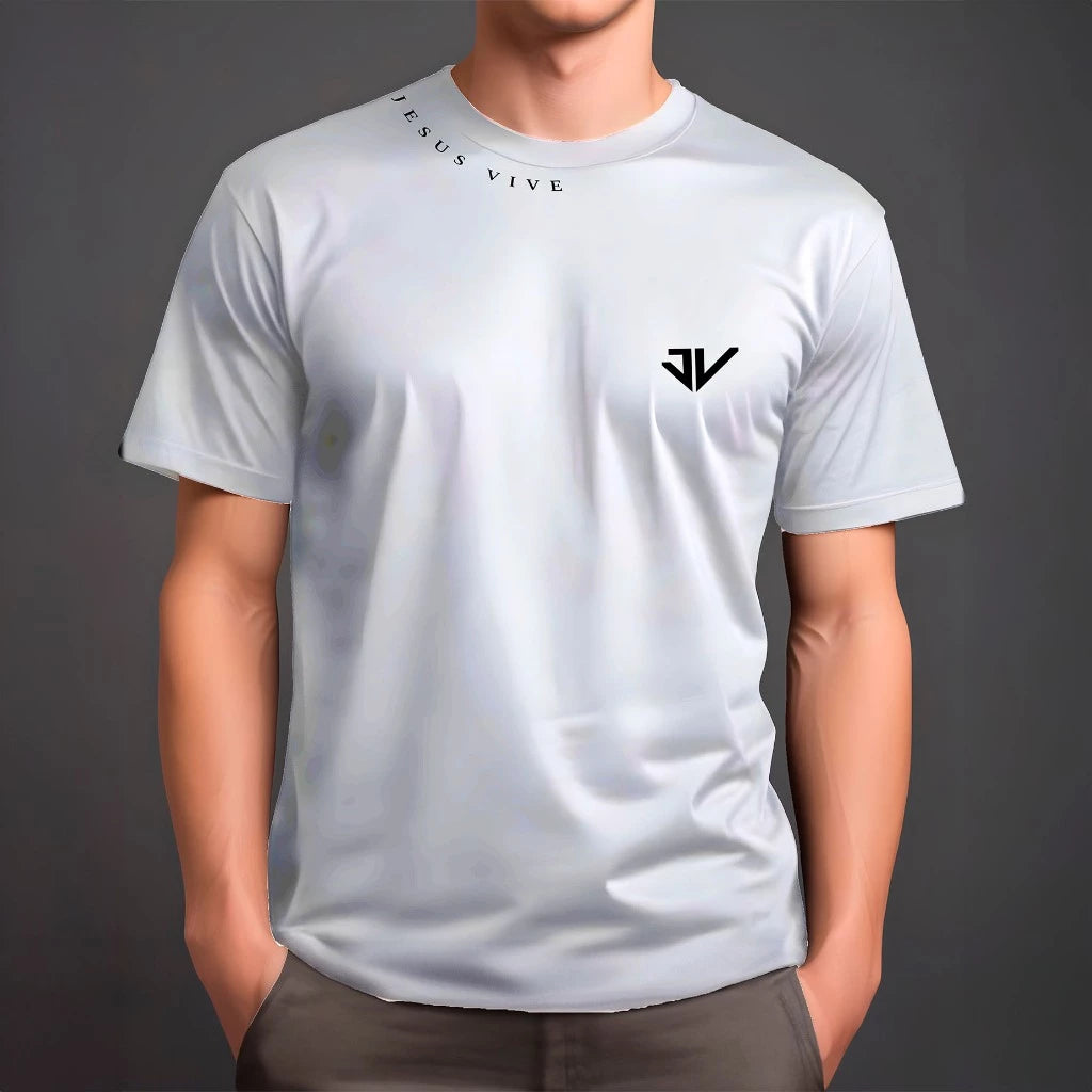 Frase Inspiradora: A frase "Jesus Vive" é estampada de forma sutil, mas impactante, ao longo da gola da camiseta, criando um visual único e elegante.