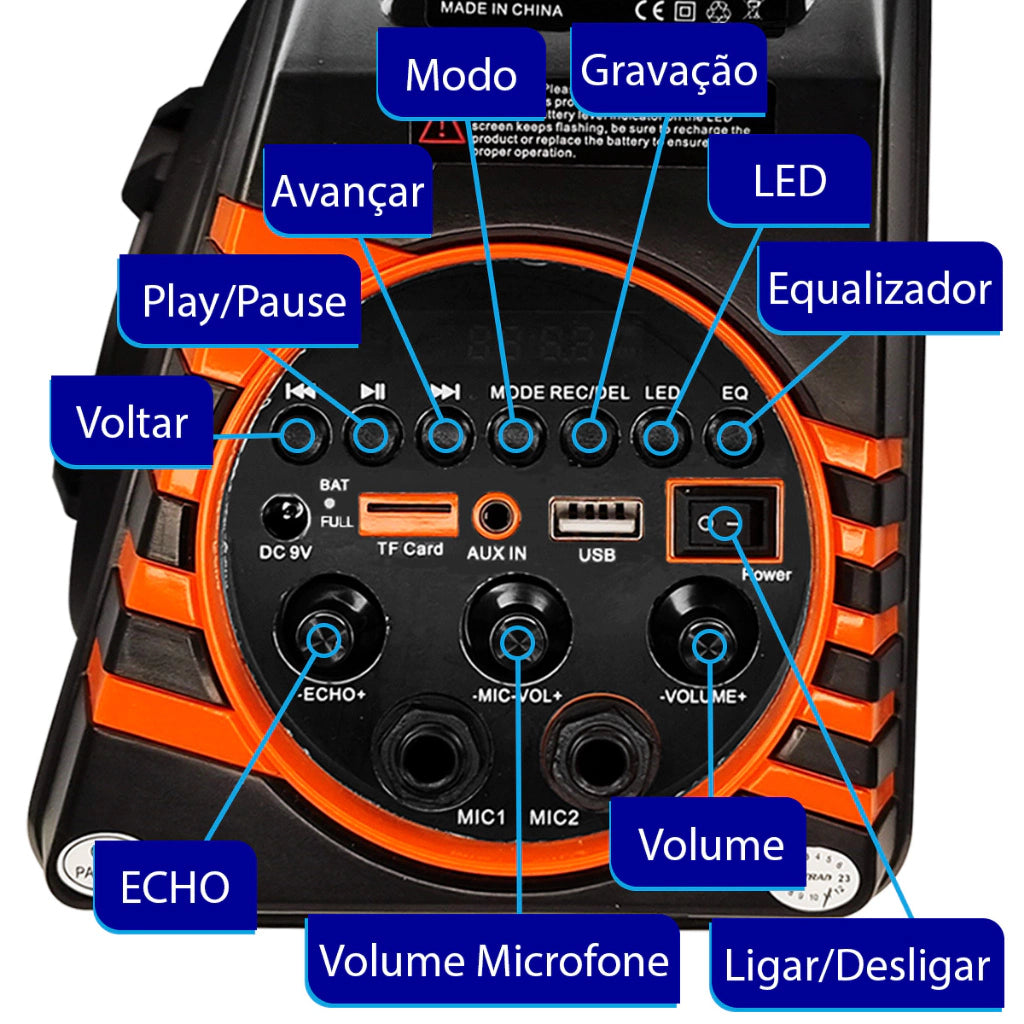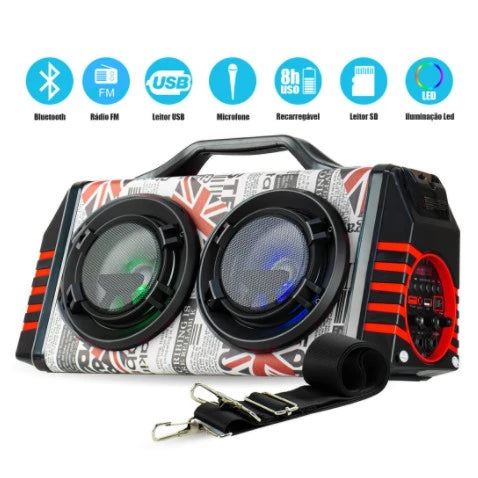 A caixa de som tem potência total de 60 Watts RMS, que possibilita ouvir suas músicas favoritas em um som alto e nítido a qualquer momento, e com dois alto-falantes de longo alcance, para incrementar ainda mais suas batidas e deixar você turbinar suas faixas favoritas com som forte e encorpado. Aumente o seu som, e mantenha a qualidade, faça a festa com as luzes do LED e alto-falante com efeitos de DJ, faça o seu próprio karaokê, divirta-se, sozinho ou com seus amigos.