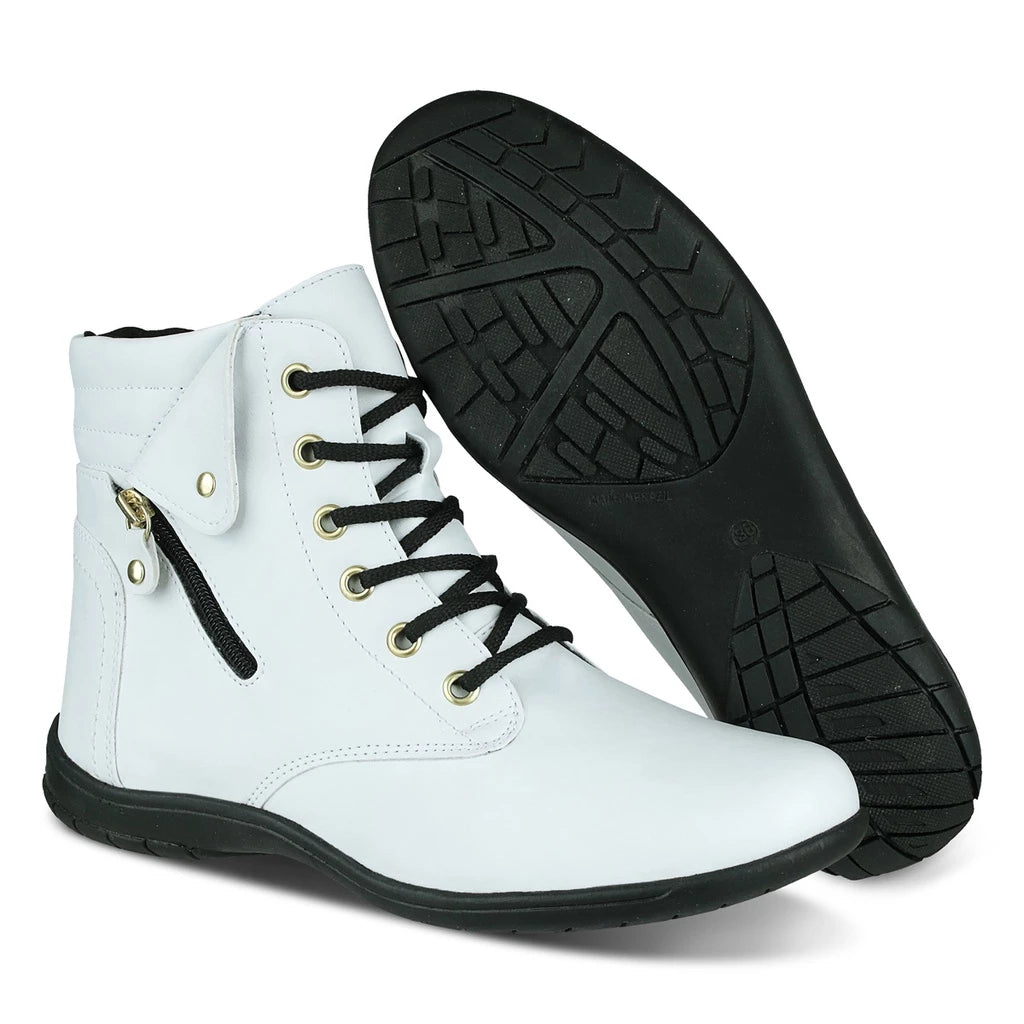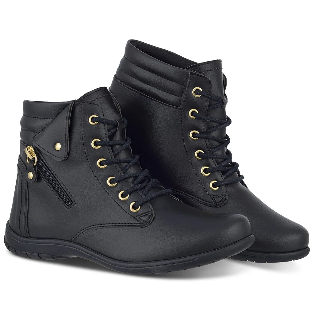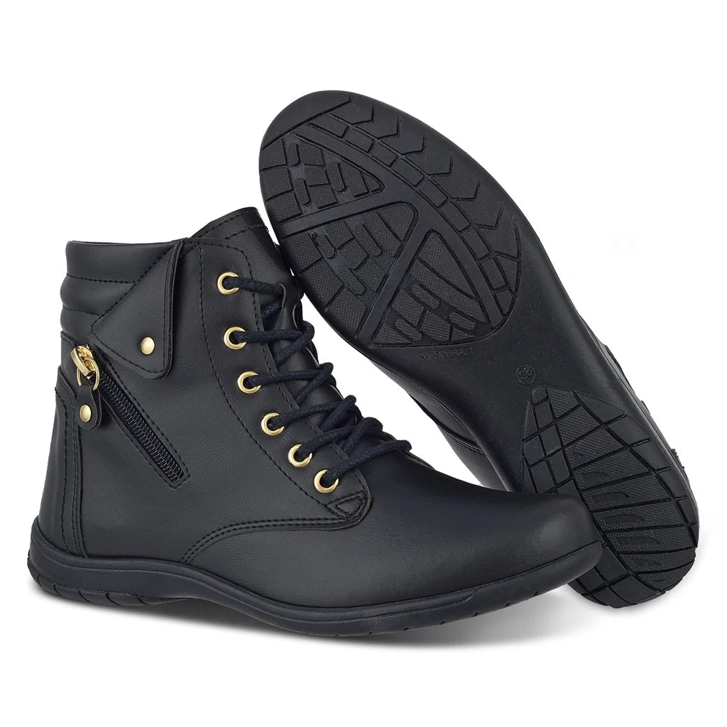 It closes with a shoelace and a zipper on the inner side, making it easier to put on.