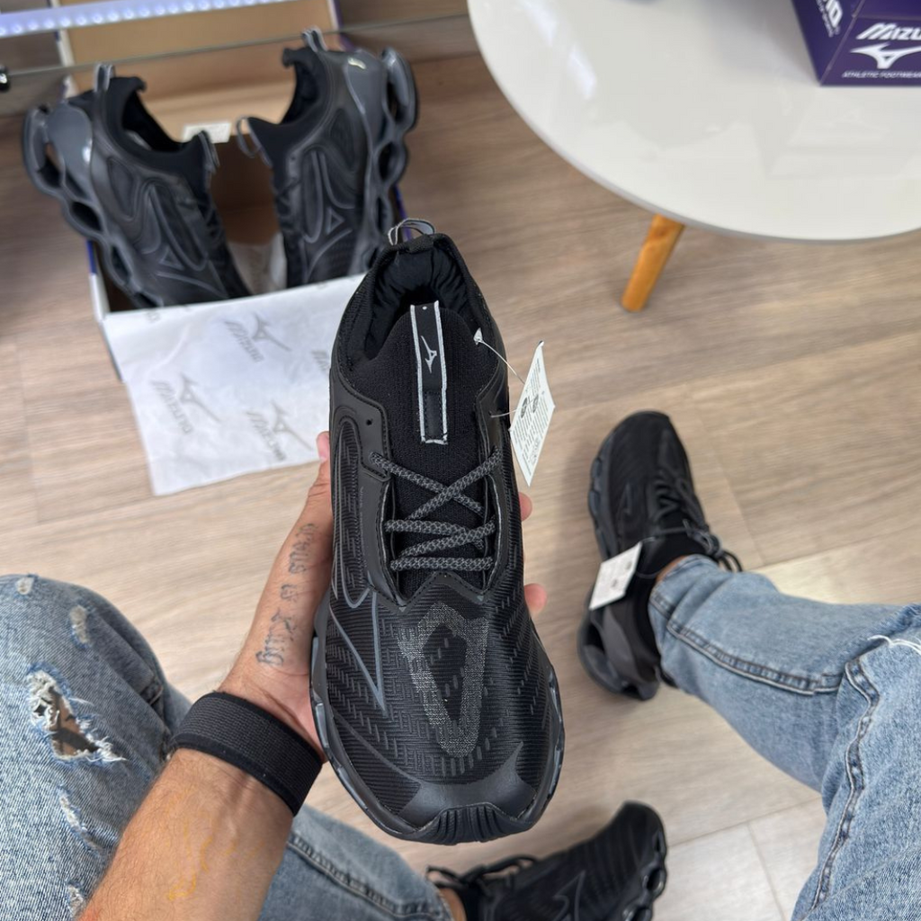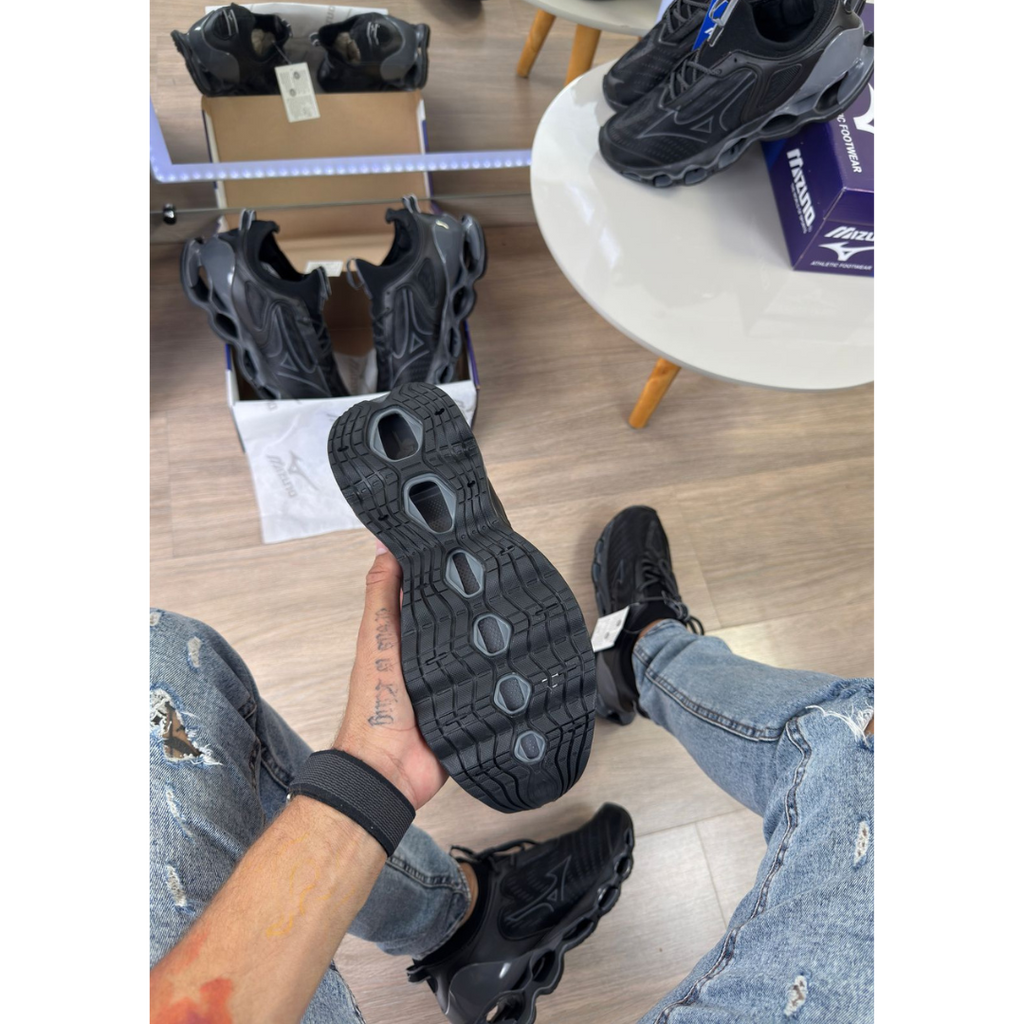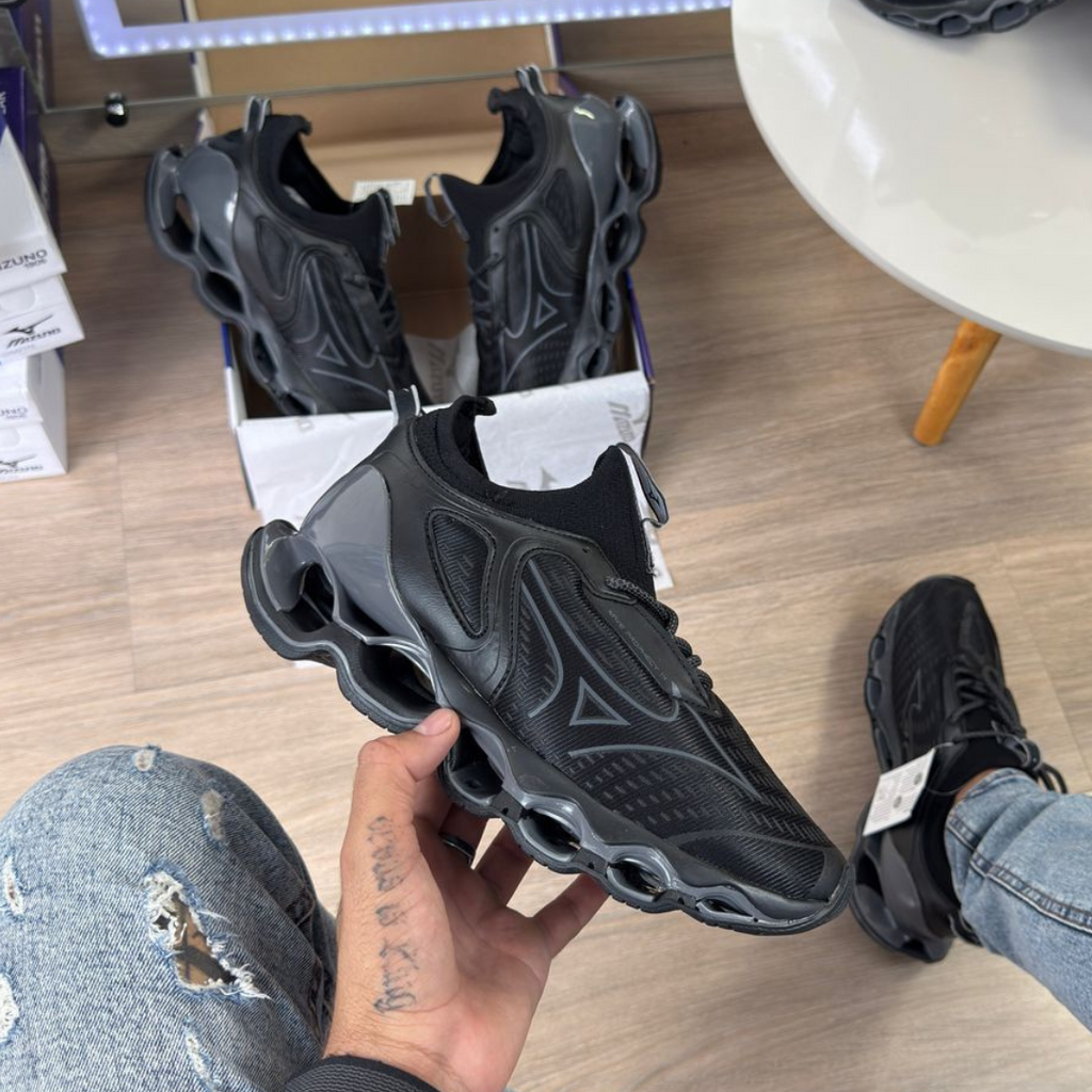 O Mizuno Prophecy 14 chega com um design renovado e ainda mais arrojado, combinando estilo e tecnologia de ponta para garantir máxima performance e conforto. Nesta versão preto/grafitti, o visual imponente e urbano se destaca, perfeito para quem busca versatilidade — do treino ao lifestyle.