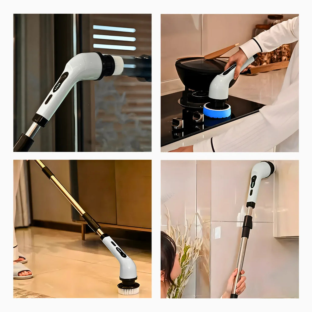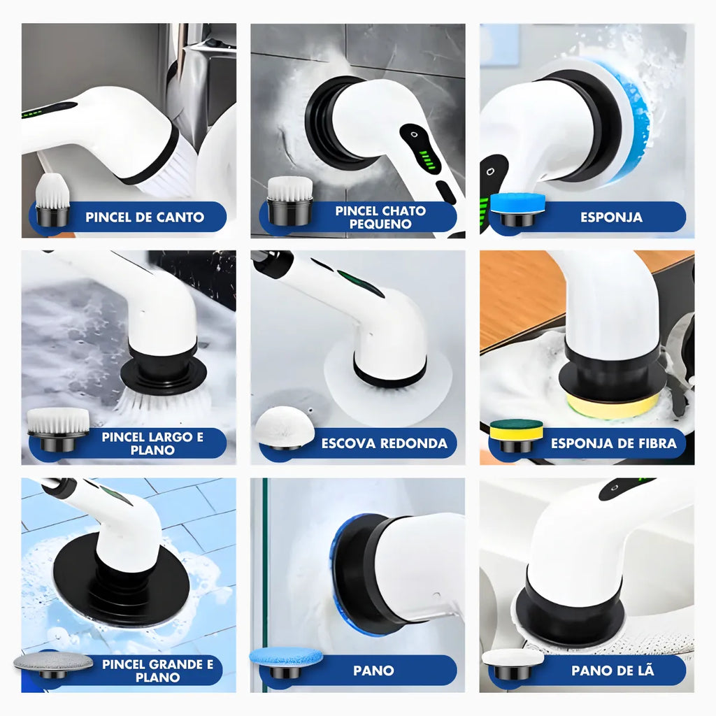 • Versatilidade em Limpeza : O Esfregão Giratório Elétrico vem com um conjunto variado de escovas e acessórios, que tornam a limpeza de banheiros, cozinhas, azulejos e outras superfícies muito mais fácil e eficaz.