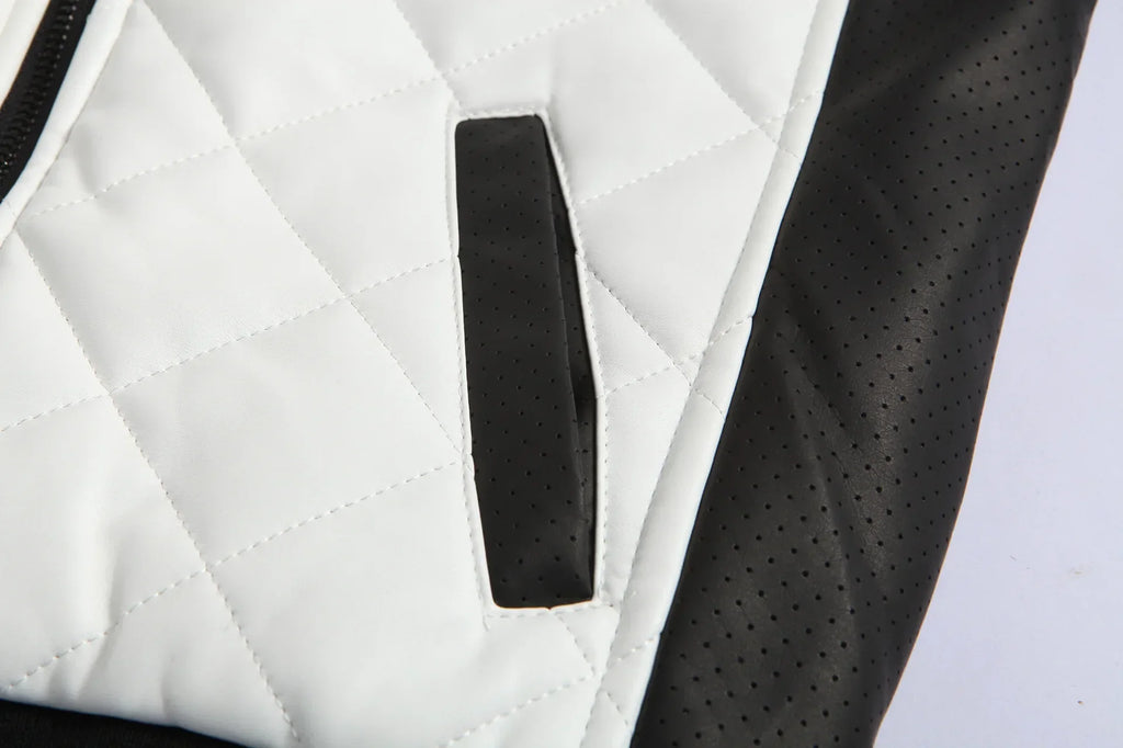 - Detalhes em couro preto nas mangas e ombros