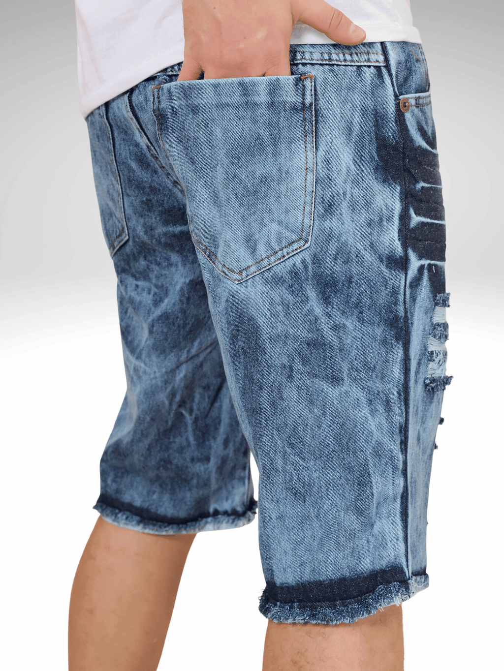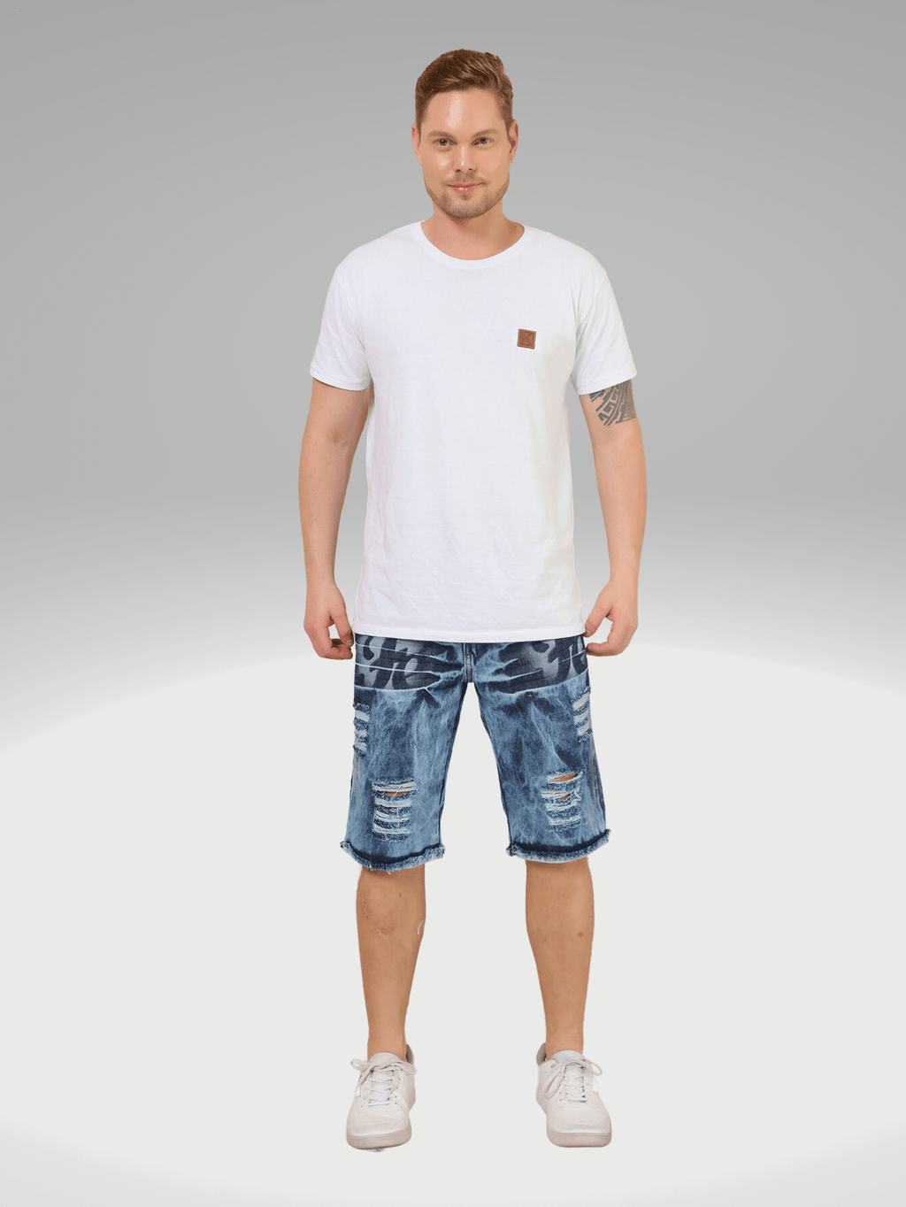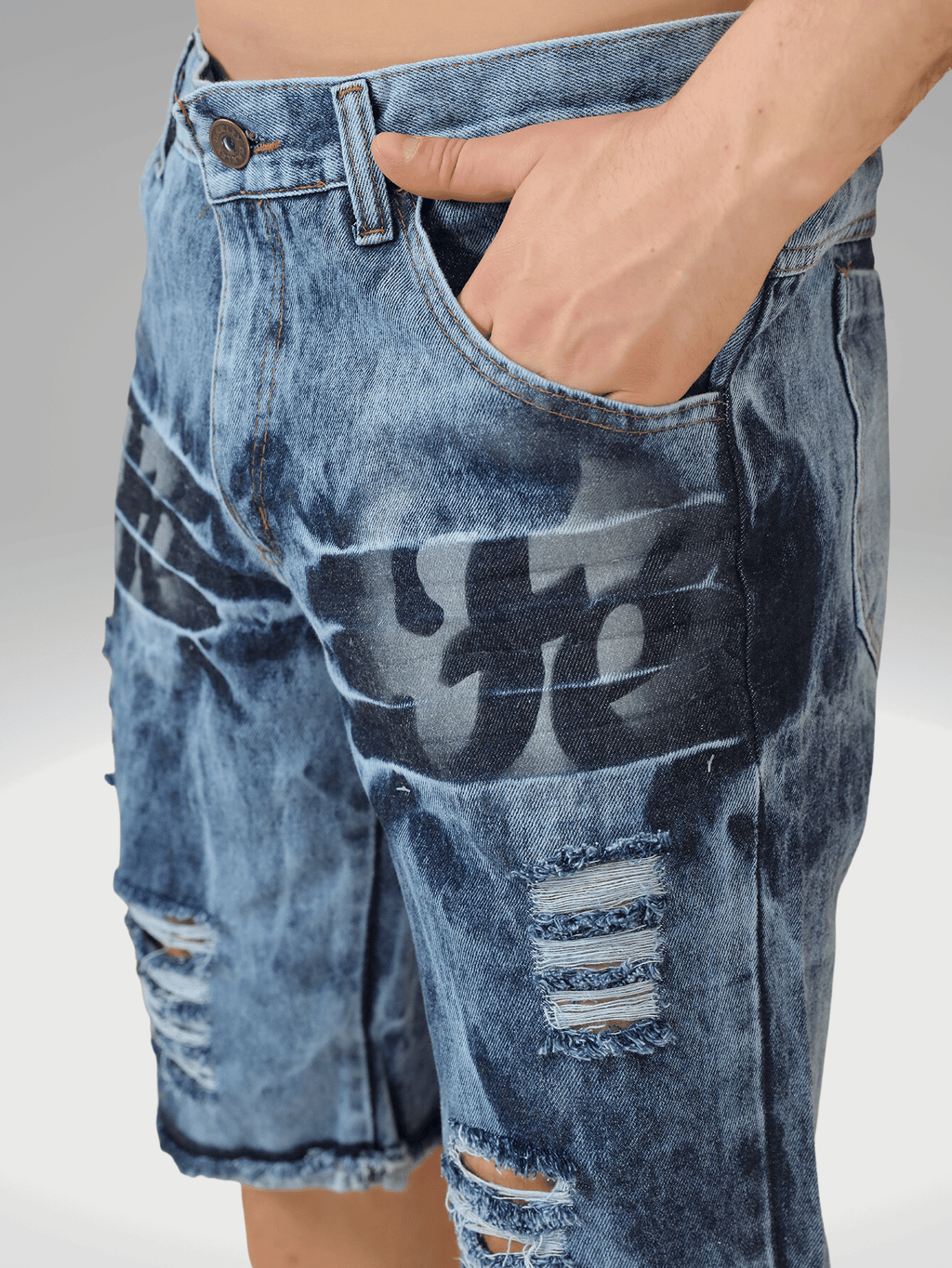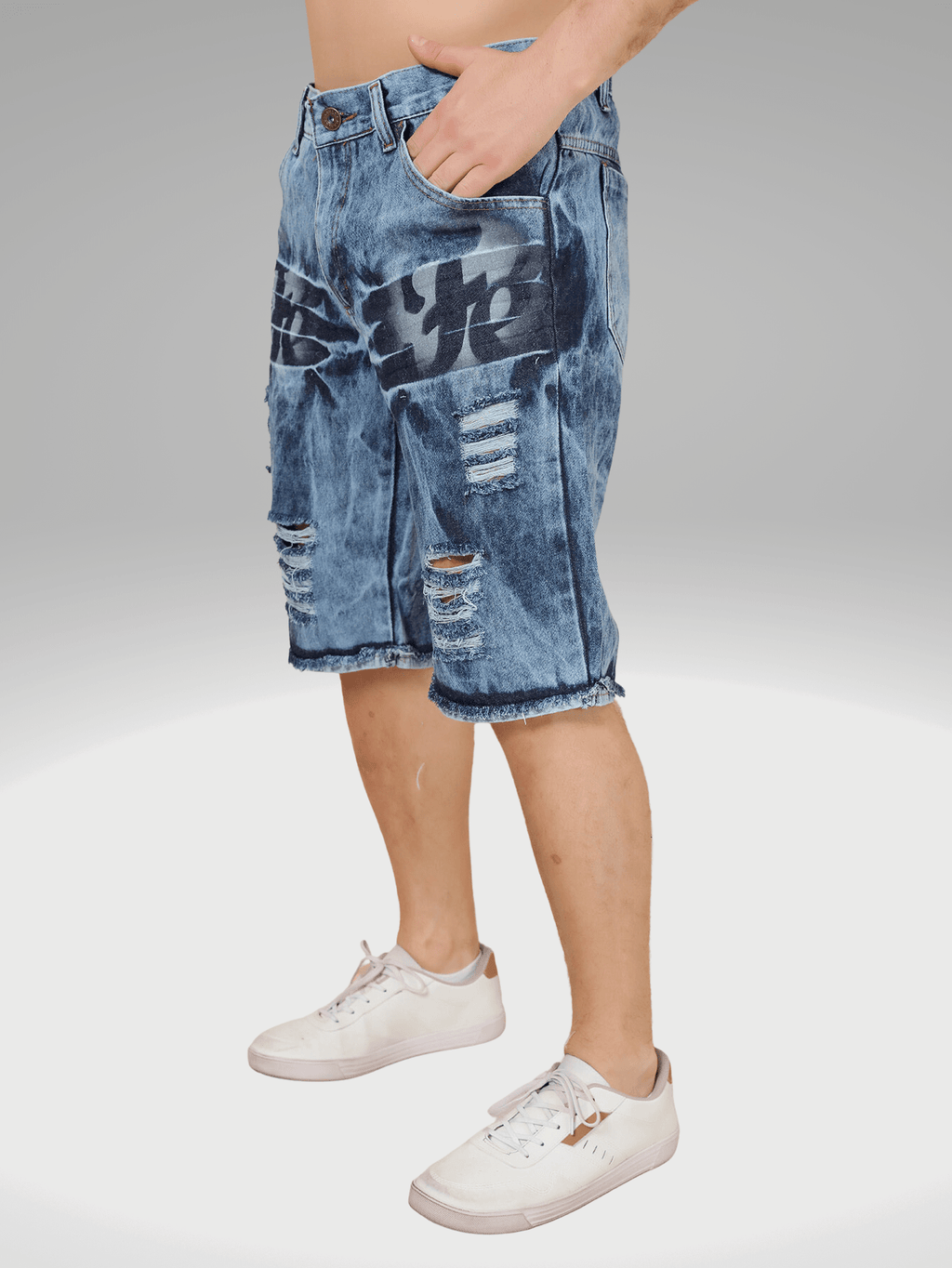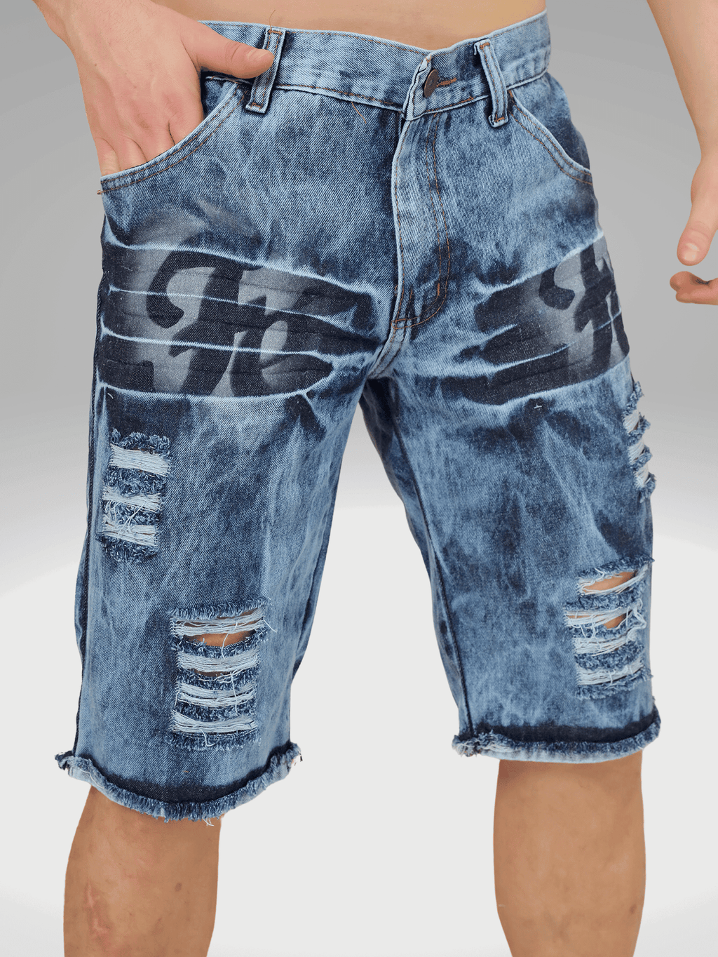 A Bermuda Masculina Jeans Destroyed com detalhes de estampa "" é uma peça que combina estilo e conforto. Feita em tecido denim de alta qualidade, apresenta um acabamento desfiado que confere um visual moderno e descontraído. Os rasgos estrategicamente posicionados adicionam um toque de ousadia, enquanto a estampa "" na parte frontal, em uma fonte impactante, traz um elemento de personalidade e significado.