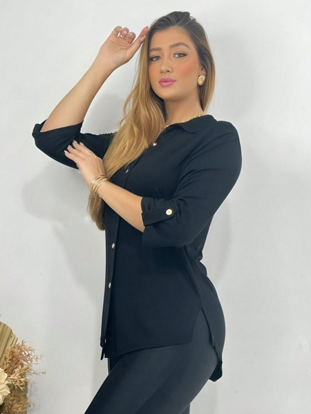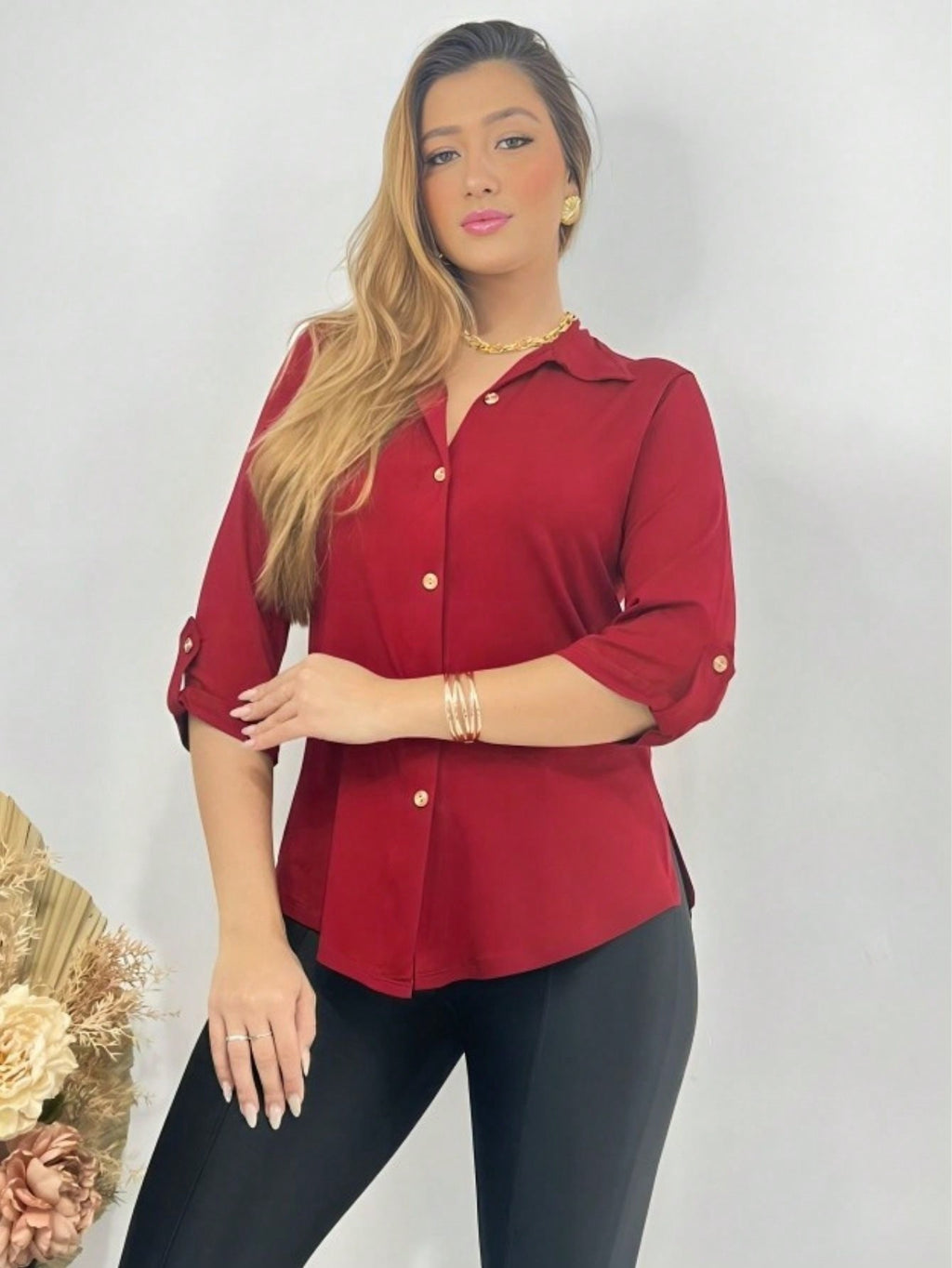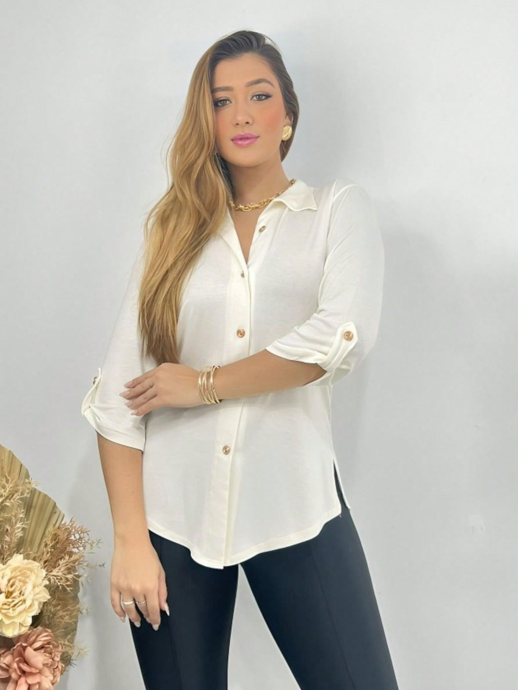 A gola colarinho proporciona um visual refinado, enquanto os detalhes na manga, como pregas ou rendas sutis, acrescentam charme e sofisticação. Fabricada em tecido leve e respirável, é ideal para diversas ocasiões, do escritório a eventos sociais.