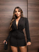 Vestido Curto Manga Longa Decote Camisa em Alfaiataria Aberto Nas Costas
