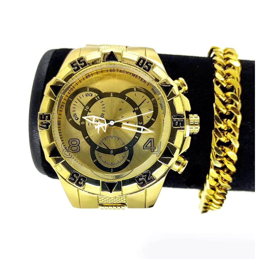 O men's gold watch set Watch kit + gold bracelet available at Amundial It's the perfect choice for a Father's Day gift. With a generously sized 23cm bracelet and an elegant 6mm thickness, this set is ideal for men who appreciate style and sophistication.