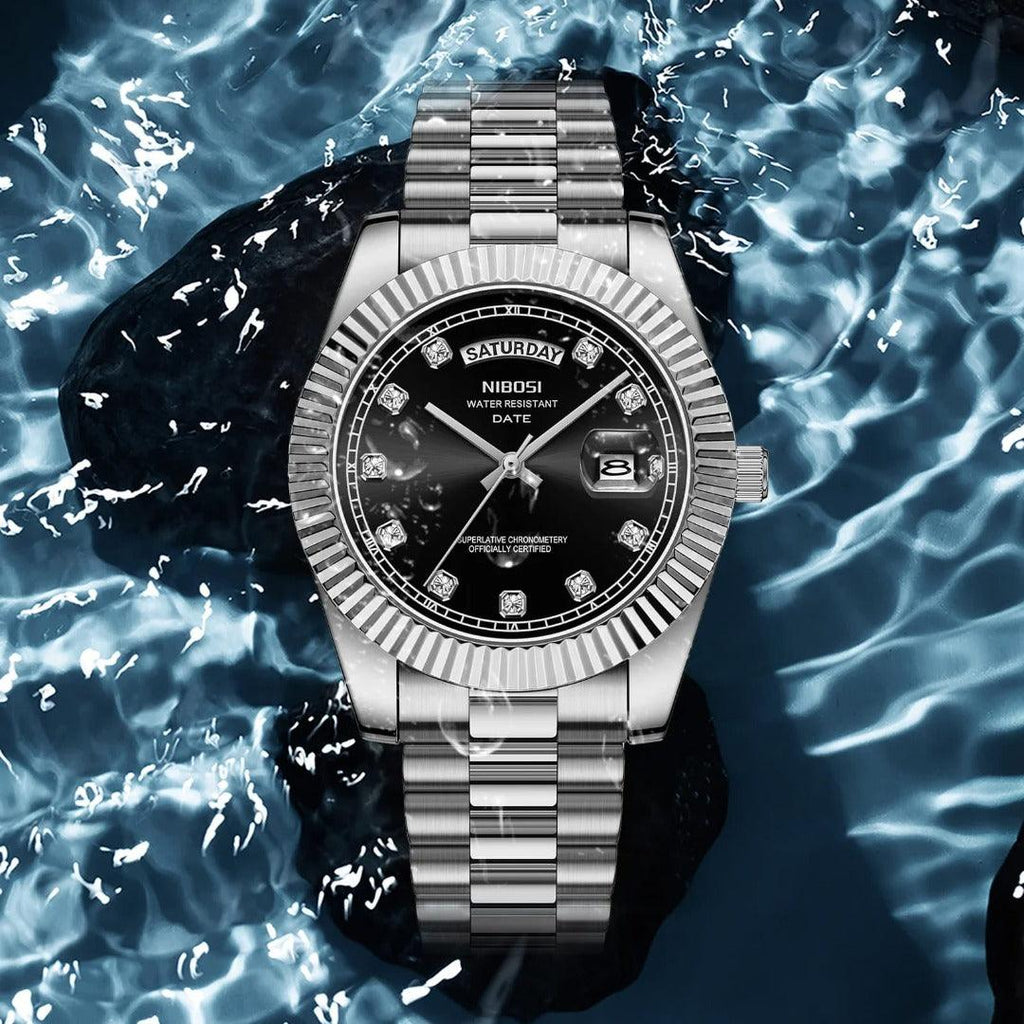 O Relógio Masculino Nibosi Date é um relógio de pulso com cronômetro, calendário automático e impermeável, indica não apenas a data mas também o dia da semana por extenso em duas aberturas separadas. Ambos mudam simultaneamente à meia-noite.