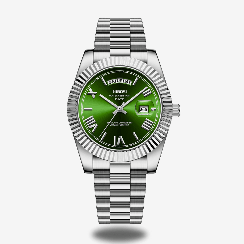 O Nibosi Date é um relógio de pulso com cronômetro, calendário automático e impermeável, indica não apenas a data mas também o dia da semana por extenso em duas aberturas separadas. Ambos mudam simultaneamente à meia-noite.