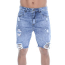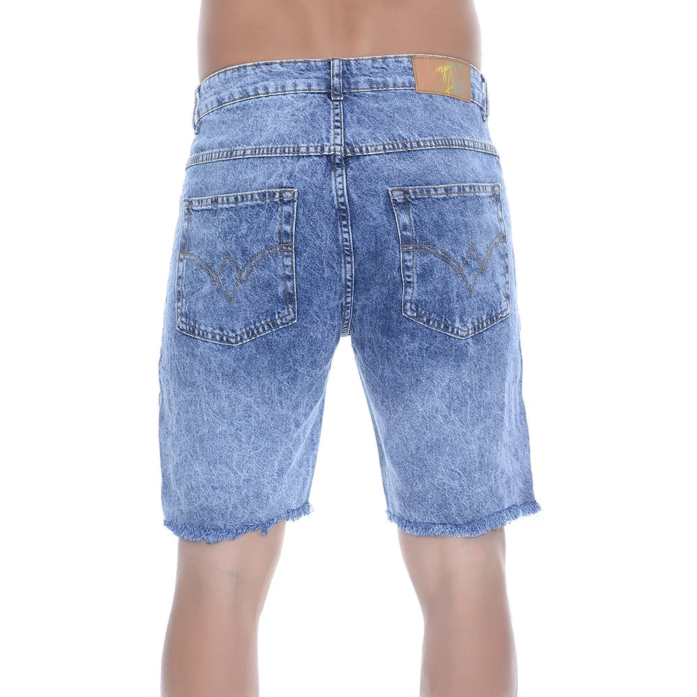 Modeling: Men's shorts made from jeans. The front has three pockets while the back has two patch pockets. It has tear details. Waistband with belt loops and built-in drawstring for fastening and closure is by button and zipper. The bar has a simple finish.