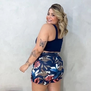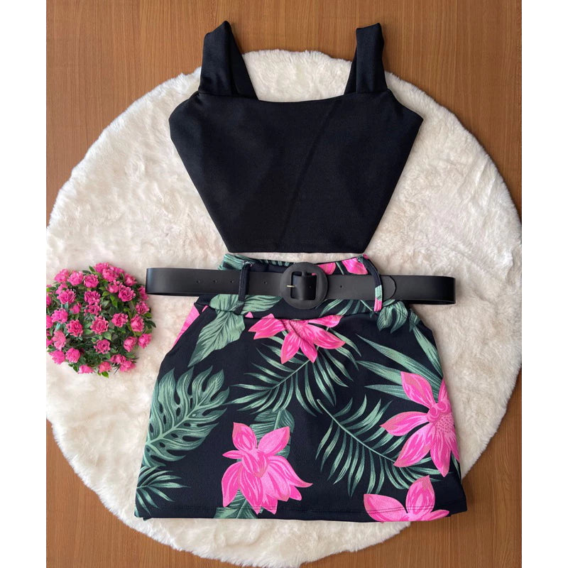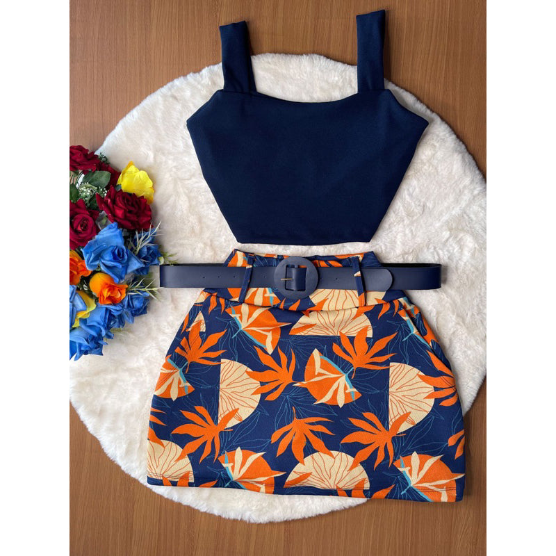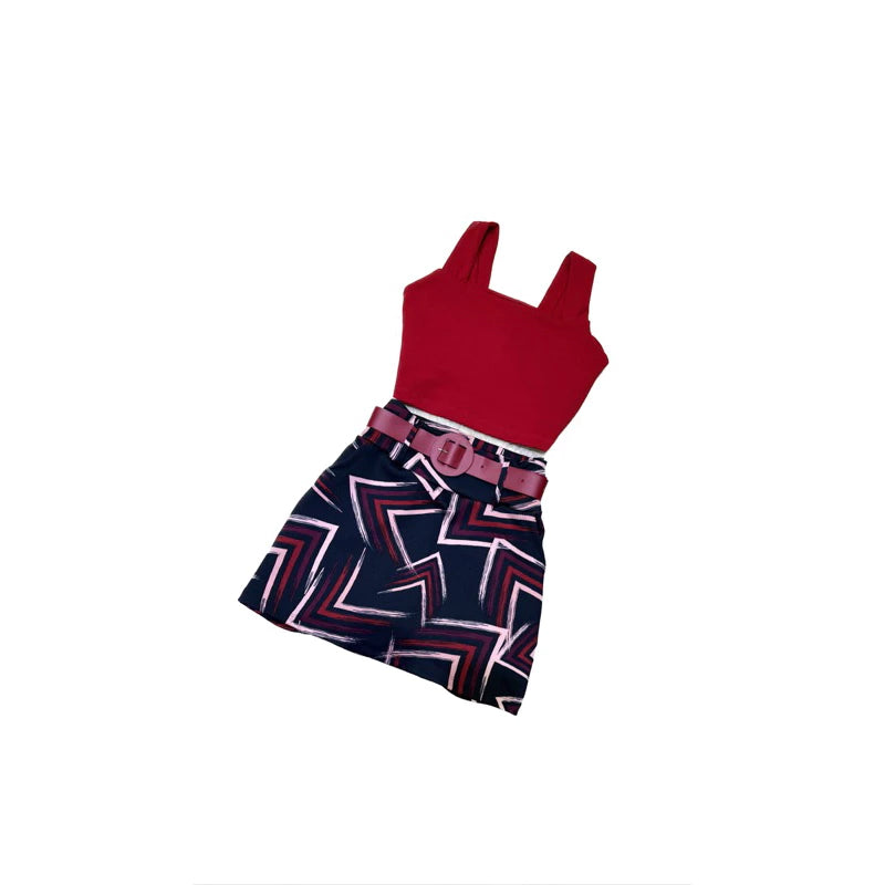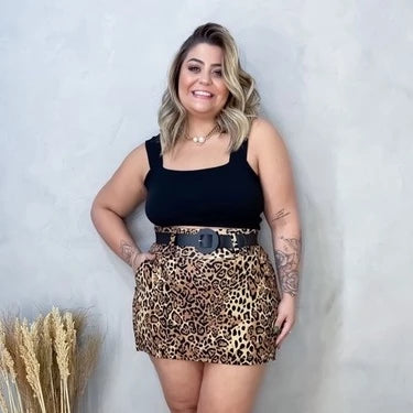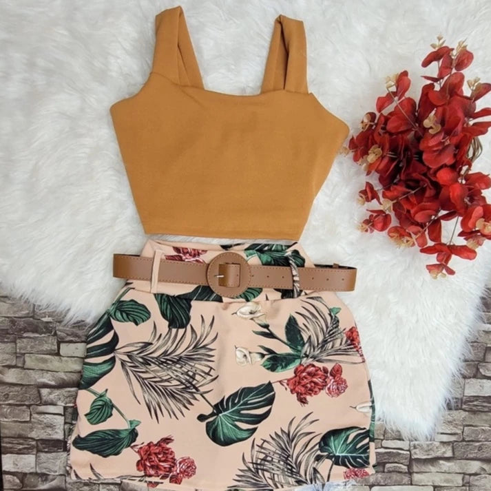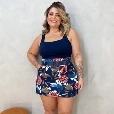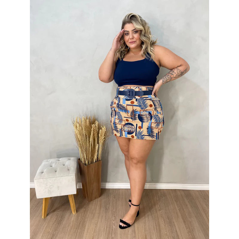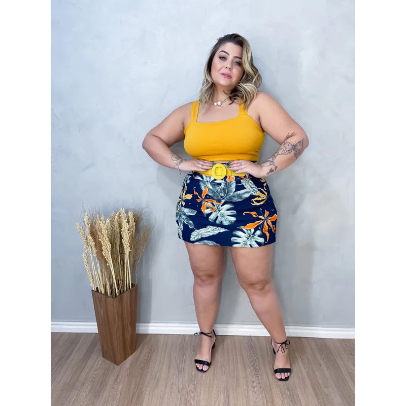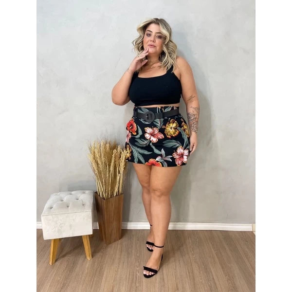 Plus Size Women's Set Short Skirt with Belt and Cropped Blouse.