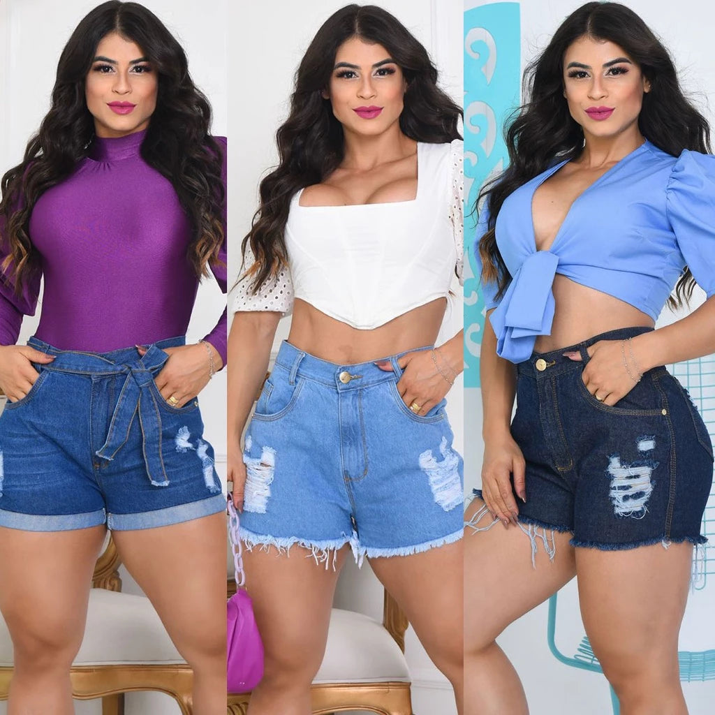 Women's mom shorts designed in super cute wash jeans. The mom fit is loose at the hips. high waist. It has front pockets and two back pockets. The waistband has belt loops and the closure is by zipper and button. The destroyed wash has tears and frays. Model with frayed finish hem and bent hem.