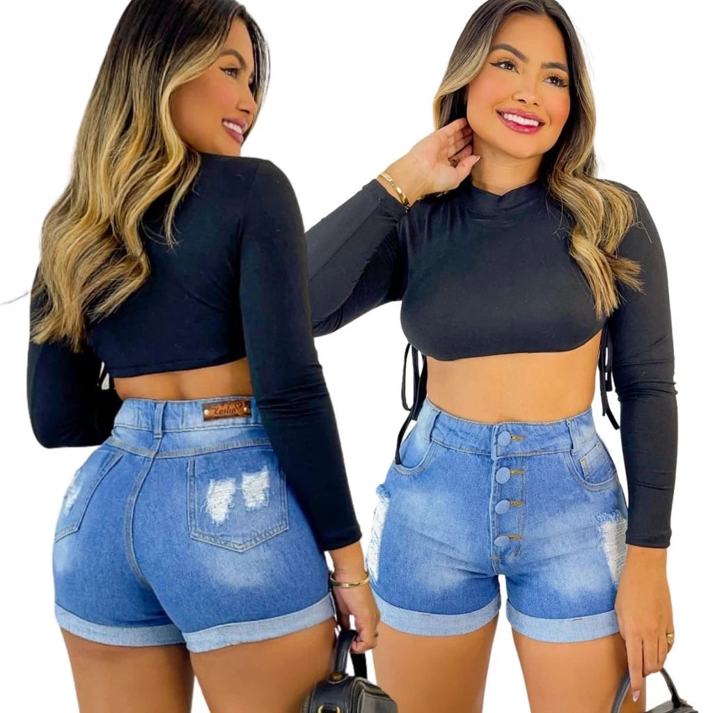 Short Jeans Feminino Cintura Alta Modelo Detonado, são especialmente desenvolvidas para Mulheres modernas e empoderadas. Com uma modelagem diferenciada que se ajusta ao corpo de maneira confortável.