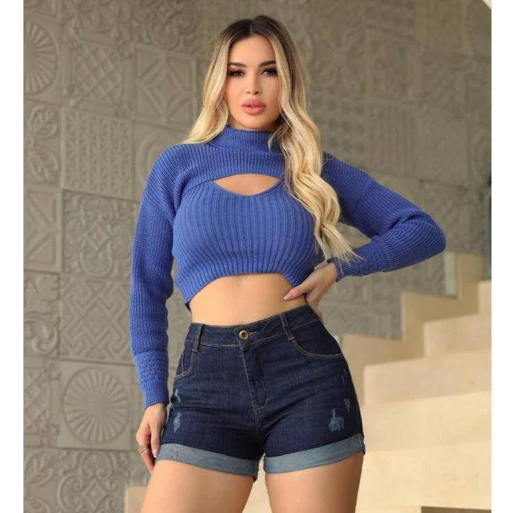 O short jeans feminino na cor azul escuro com lavagem sobretinto é uma peça sofisticada e cheia de estilo.