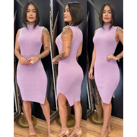 Midi Dress With A Side Slit High Neck Ribbed Fabric.Sizes: