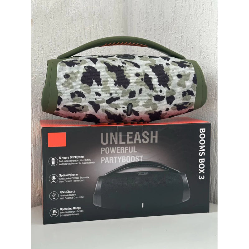 Caixa de som bombox, caixa de som Bluetooth portátil ainda melhor. A silhueta icônica da Boombox 3 tem uma nova e ousada atualização com uma alça de metal resistente e partes em silicone, tampas laterais duplas e tecido exclusivo à prova d'água e à prova de poeira. Ela também foi redesenhada por dentro, acrescentando um novo subwoofer que reproduz graves muito mais profundos e o potente Original Pro Sound, tudo sem qualquer sinal de distorção E 24 horas de reprodução levam você desde o treino matinal até um fim de noite com seus amigos. E para um som praticamente ilimitado, conecte instantaneamente várias caixas de som com o aplicativo JB Portable.