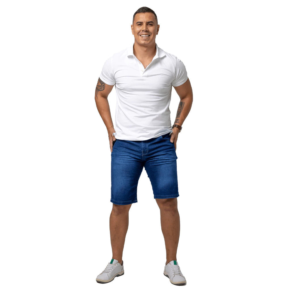• O tecido é composto por 86 % algodão, 16% Poliester e 2% Elastano para garantir maior Flexibilidade e conforto. Bermuda Jeans Masculina com Lycra - Bermuda Jeans Masculina com Elastano.