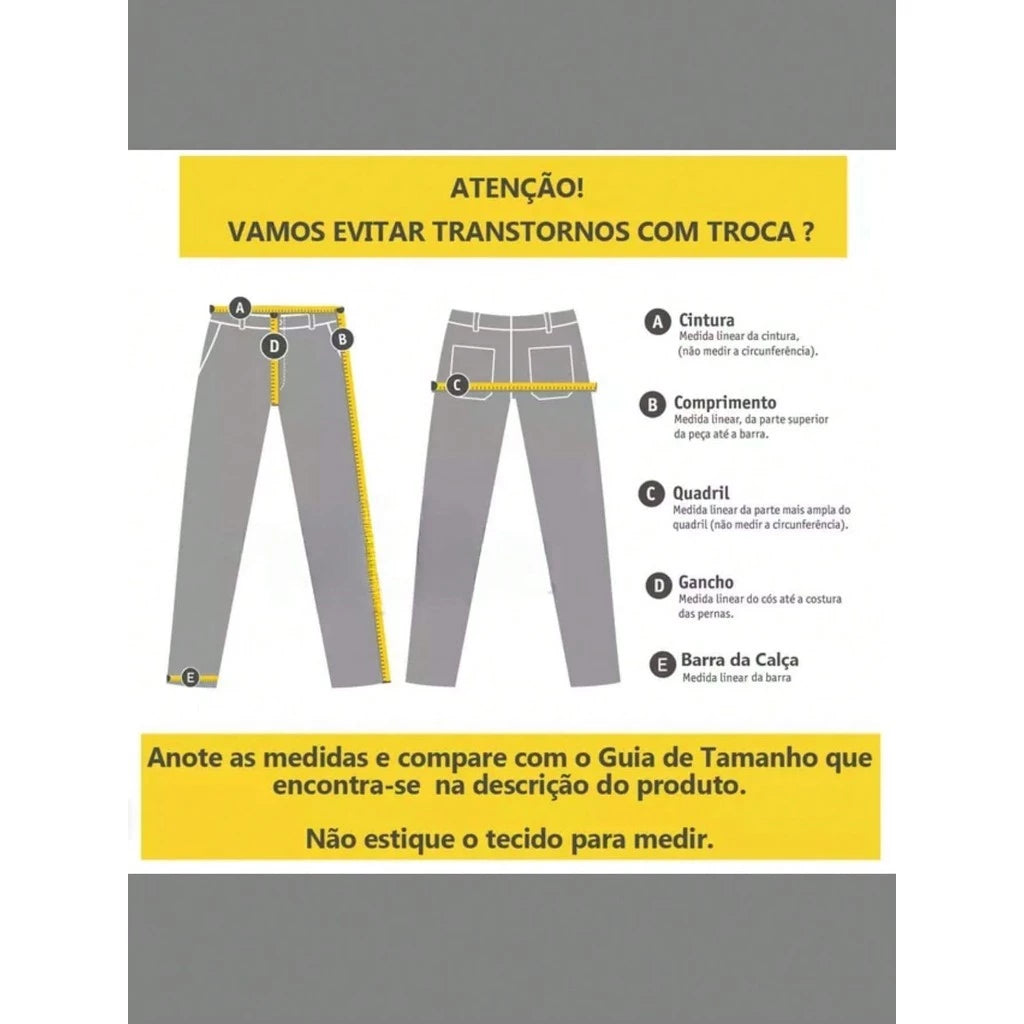 • Detalhes adicionais: Costura reforçada, cinco bolsos, cintura média, barra feita.