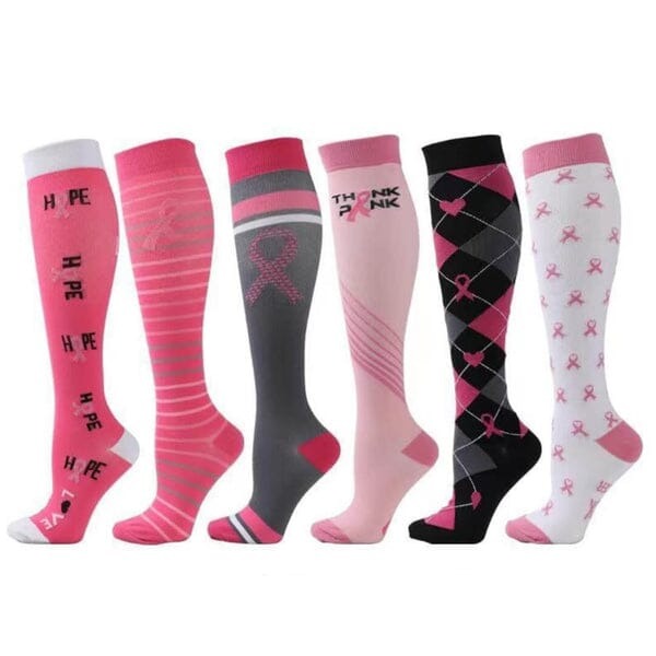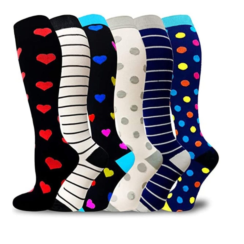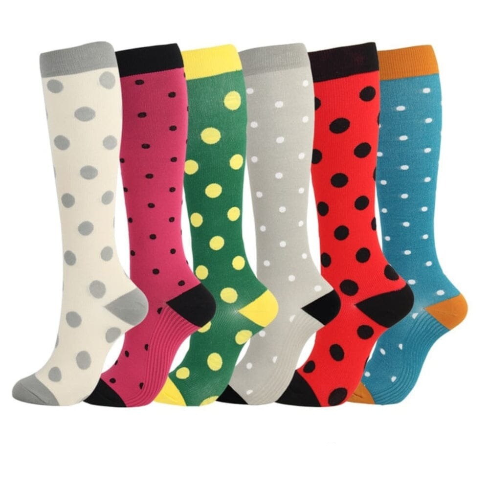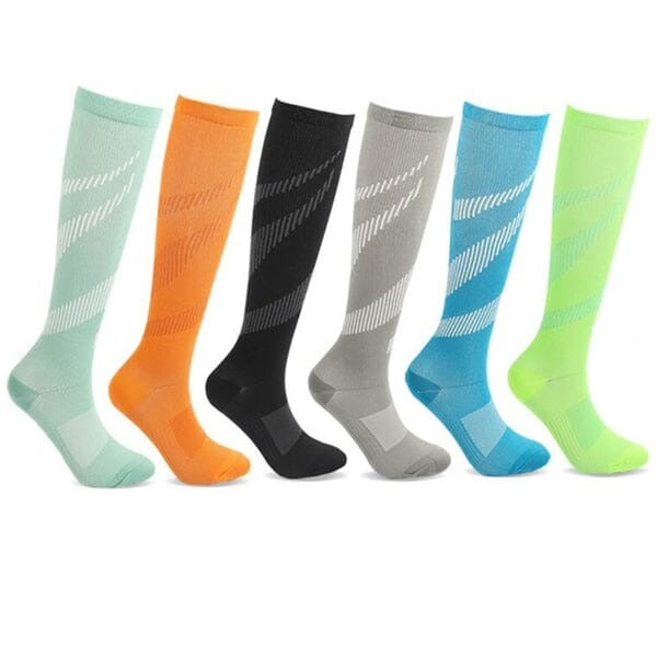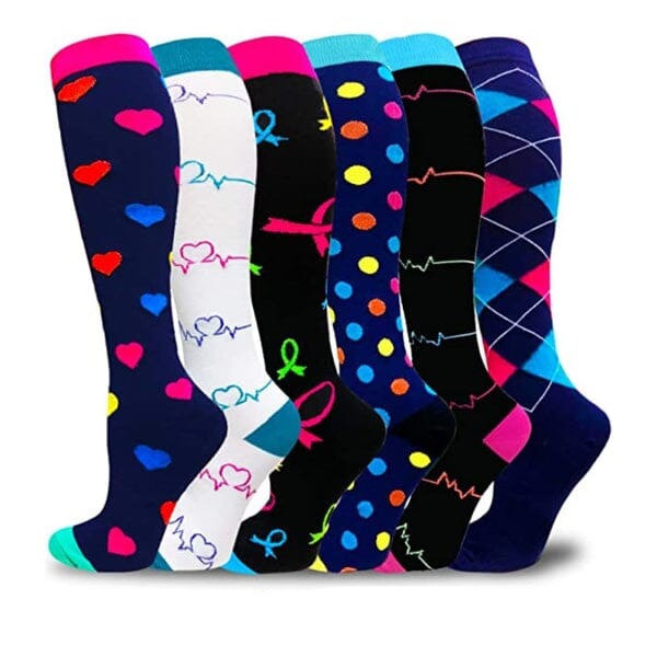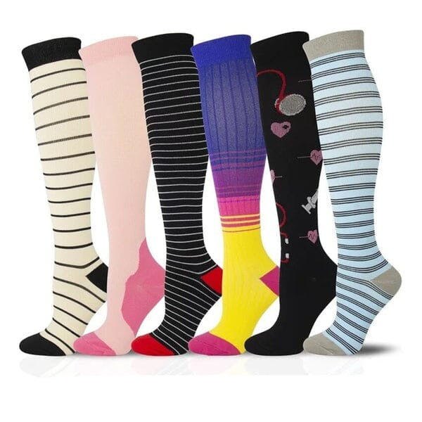 Trate as veias varicosas com as nossas meias de compressão coloridas! A compressão começa mais forte ao redor do tornozelo e se solta até o joelho para estimular o fluxo sanguíneo adequado.