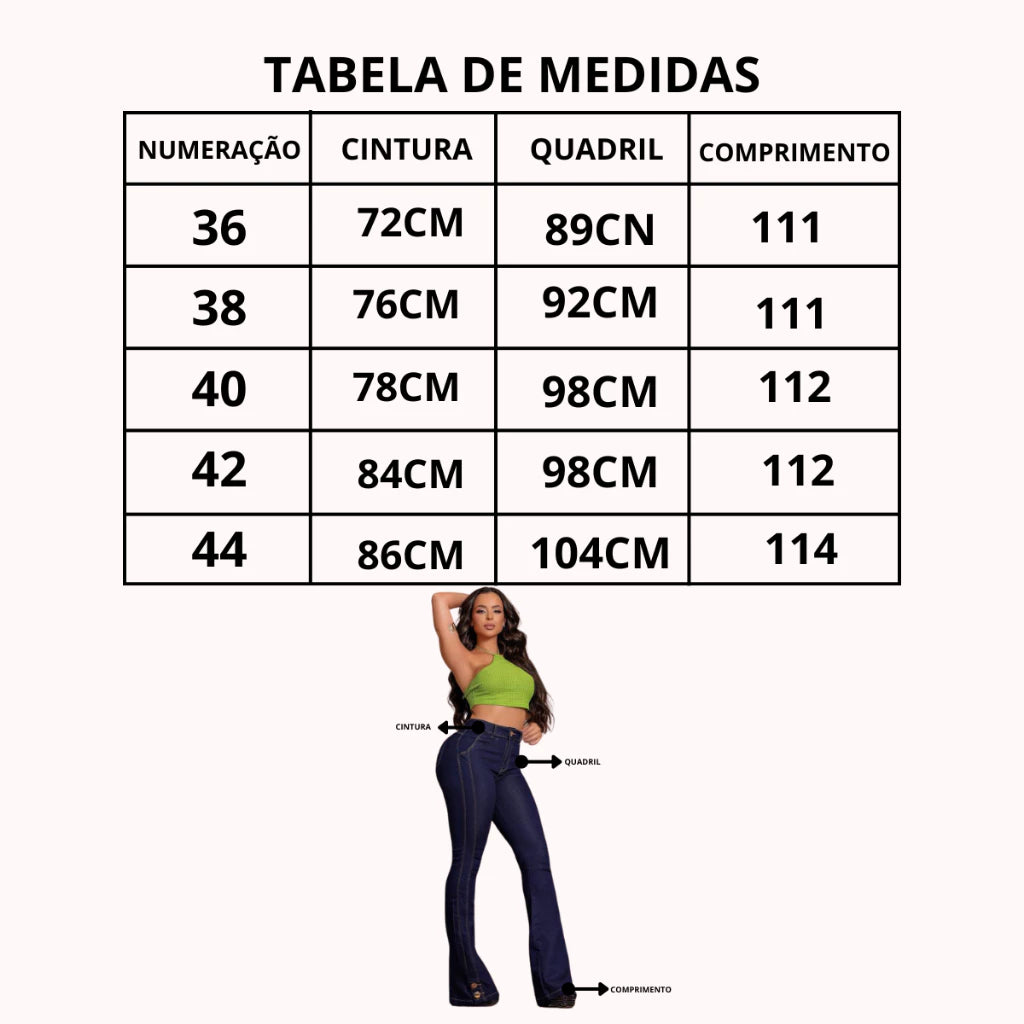 Número 40 serve para quem tem a Cintura de 77 a 81 cm e o Quadril com 81  a 84cm - Comprimento: 111 cm
