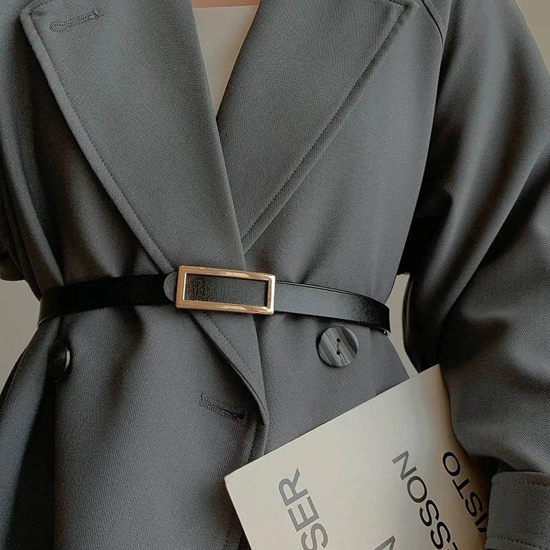 Adicione um toque de elegância ao seu guarda-roupa com nosso cinto de couro com fivela retangular dourada.